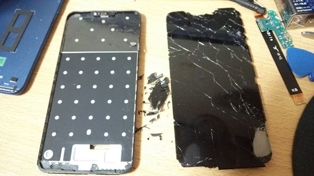 なお事前に調査しましたところドライヤーなどで熱を加えながら作業したほうが剥がしやすいとの事だったのですが、もはやバッキバキのディスプレイにかける情けなど無くバックカバー同様に己の力のみで挑むことにしました。